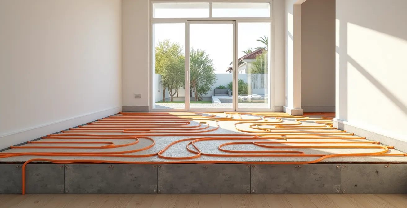 Aquí es donde el suelo radiante se revela como un verdadero compromiso estructural. Su instalación no es simplemente colocar tubos bajo el pavimento; requiere un recrecido completo del forjado. Un sistema tradicional de suelo radiante por agua implica varias capas: panel aislante, tubos, mortero autonivelante y, finalmente, el pavimento. Todo este conjunto necesita una altura considerable.